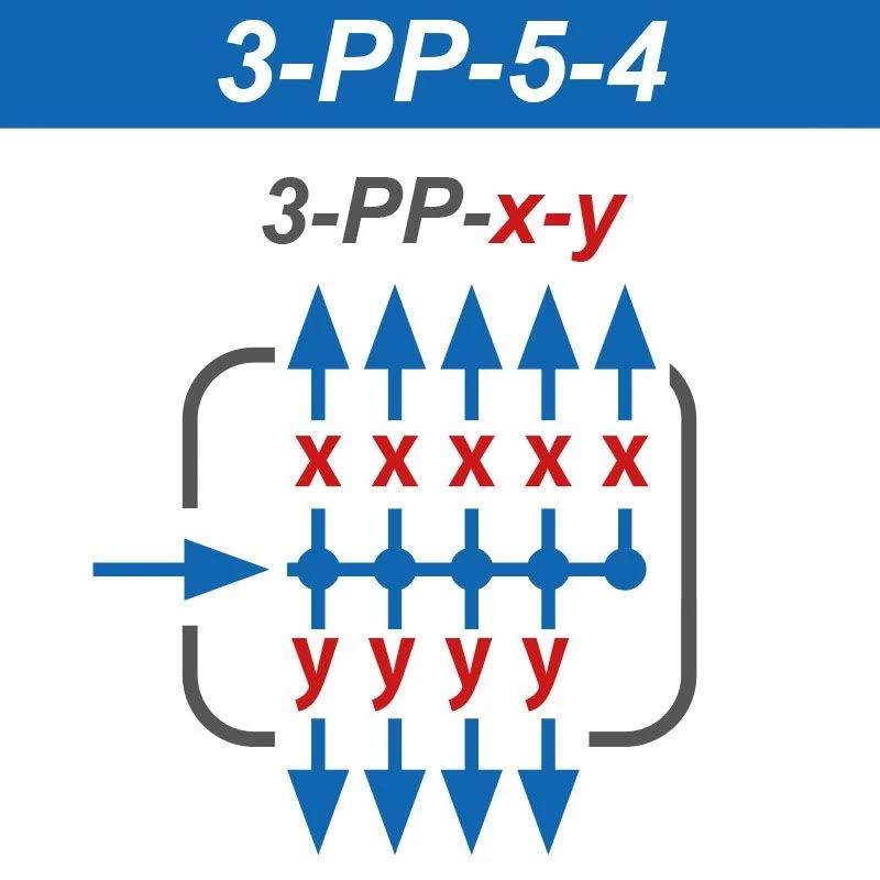 – 5 Ventile in Flussrichtung links, 4 Ventile in Flusrichtung rechts