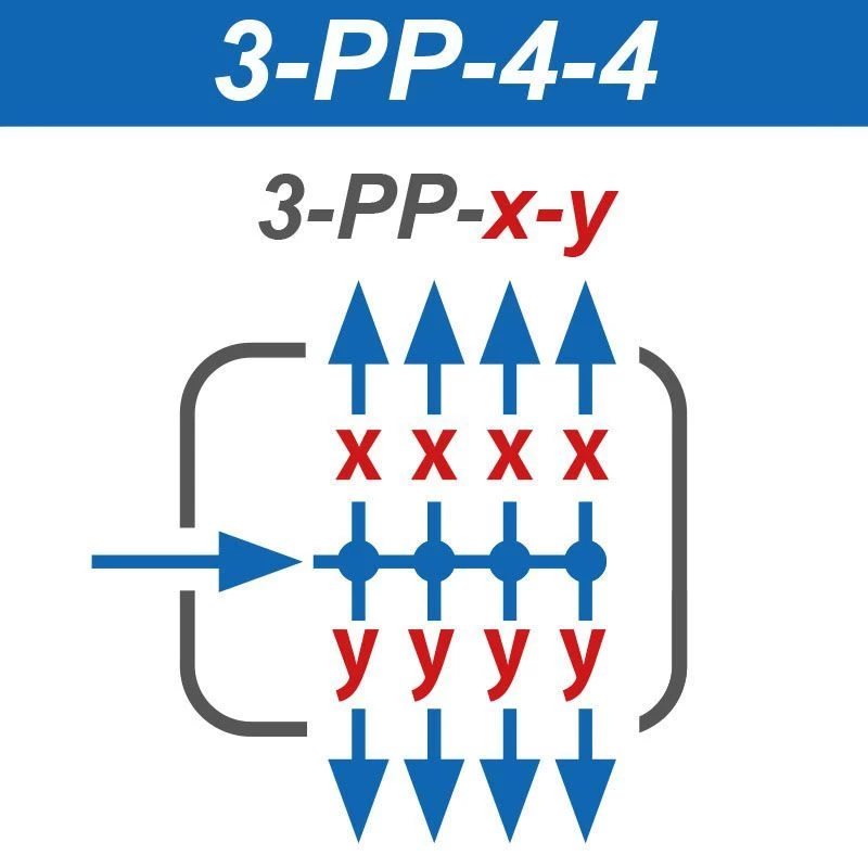 – 4 Ventile in Flussrichtung links, 4 Ventile in Flussrichtung rechts