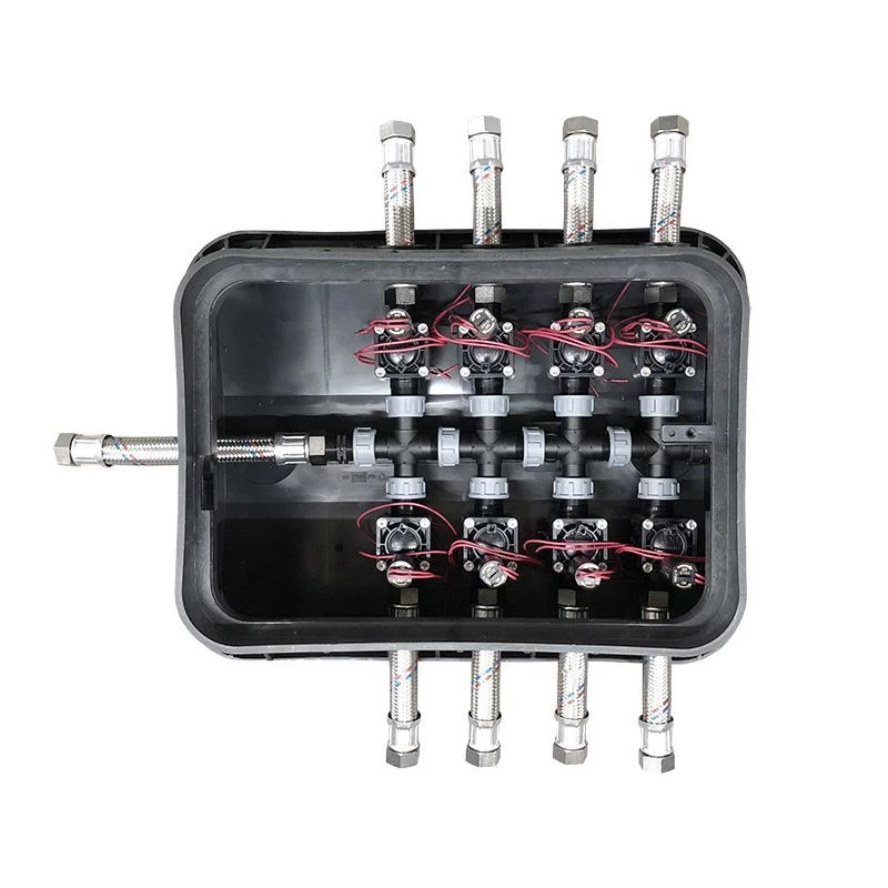 – Express-Ventilbox, PP-Ausführung, 4 Ventile in Flussrichtung links, 4 Ventile in Flussrichtung rechts, einbaufertig vormontiert, mit hochwertigen Magnetventile 24 VAC, Überwurfverschraubungen mit 1″ Innengewinde und Boden, ohne Anschlussverschraubungen