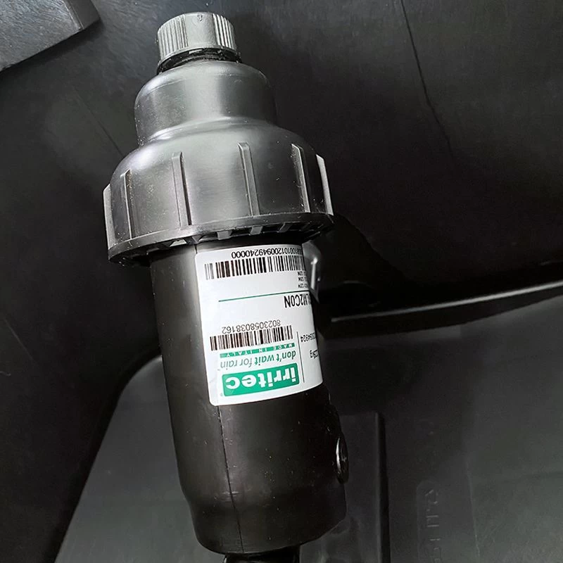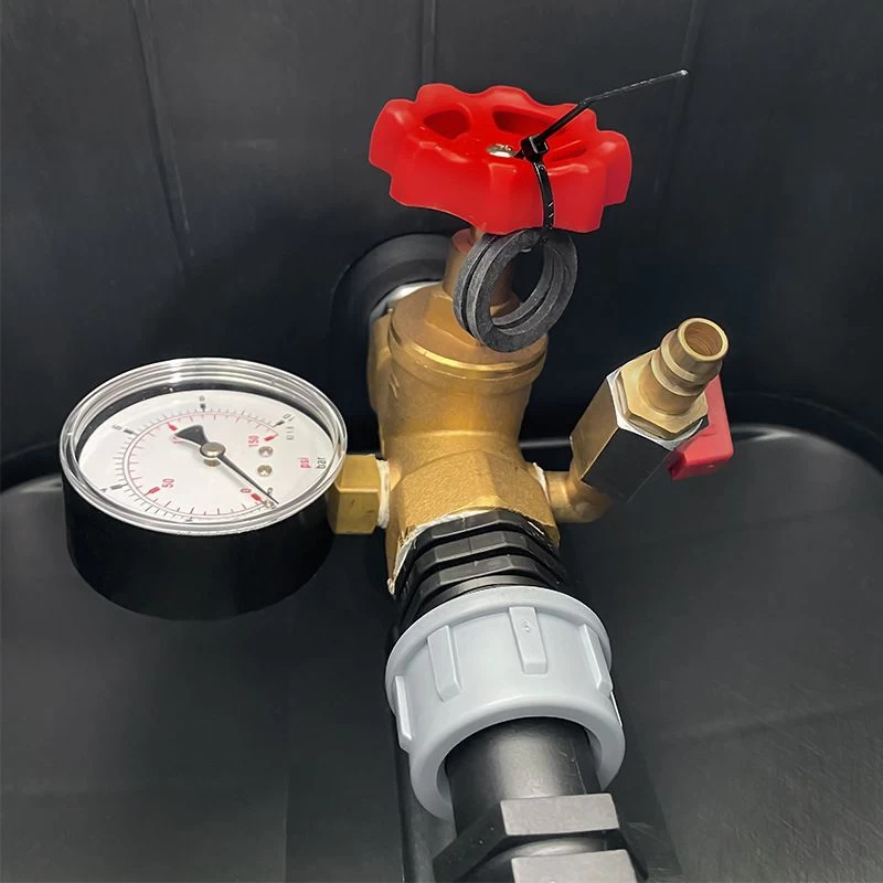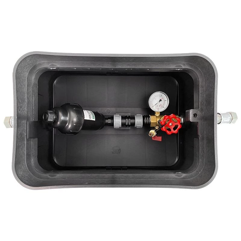 Filterbox für Beregnungsanlagen mit Kunststoffüberwurfverschraubungen, Absperrschieber, Manometer und Druckluftstecknippel zur Winterentleerung