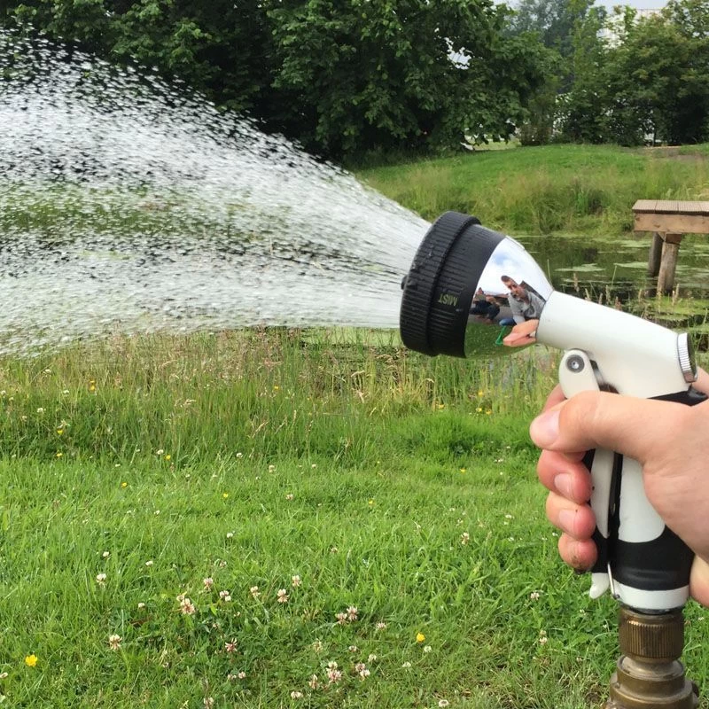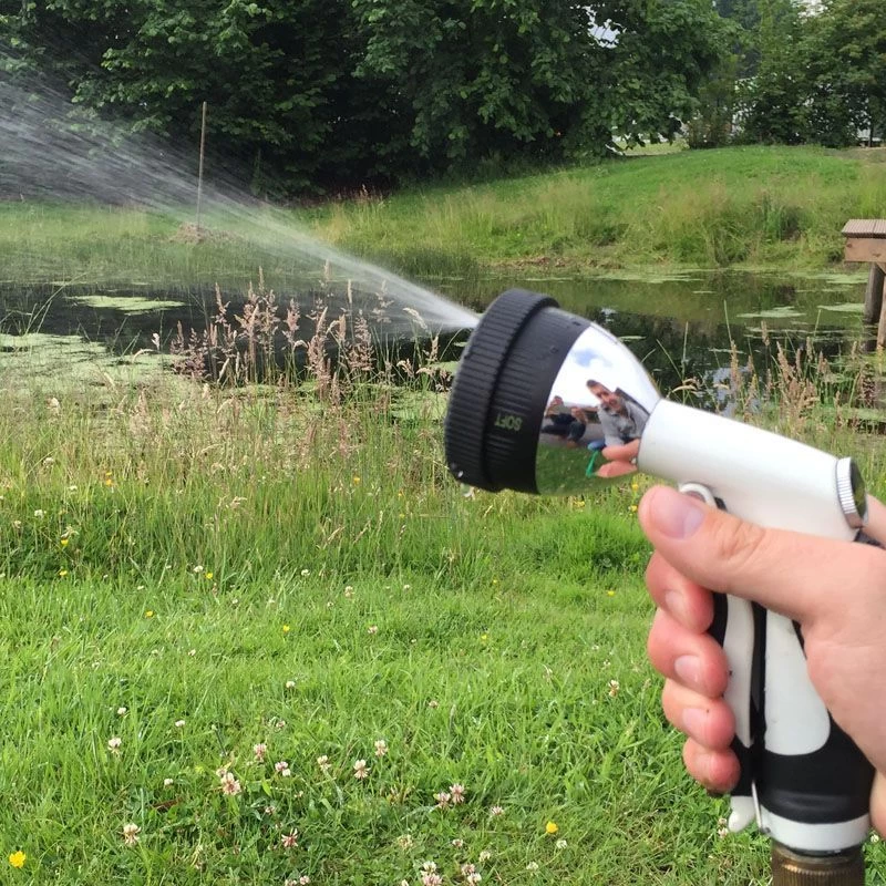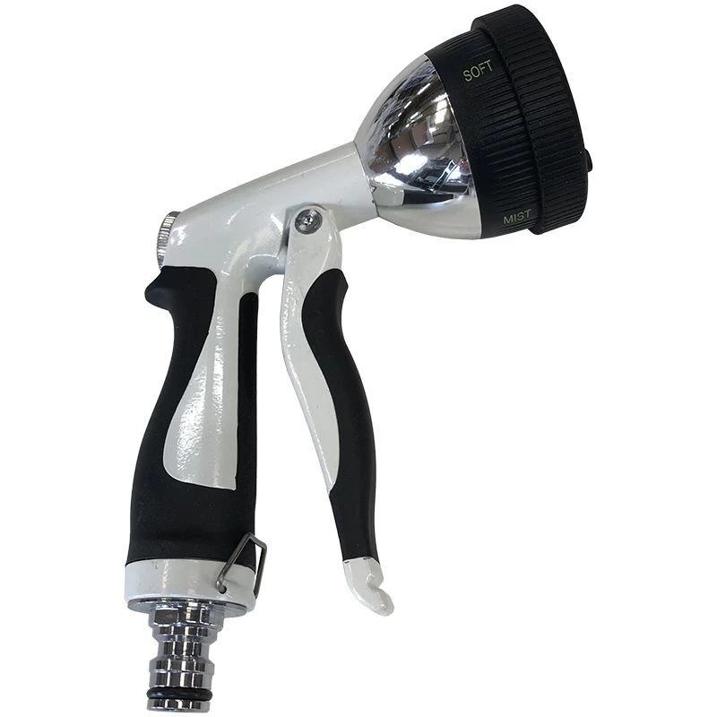 Die Profi-Gartenbrause hat einen Quick-Klickanschluss mit Stecker. Die Brause besteht aus Zickdruckguß und Messing. Sie hat eine 9 mm Bohrung an der Steckkupplung zum Anschluss an Gardena-Schlauchsysteme.