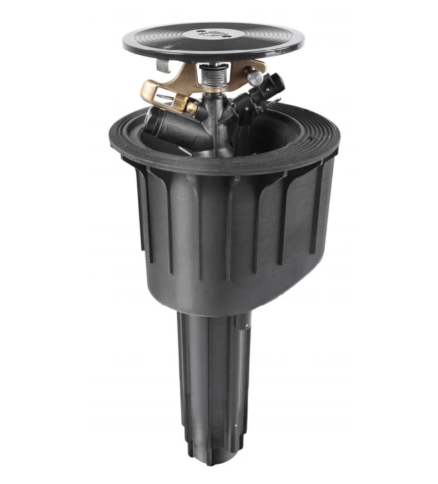 Der Regner besteht aus einem schwarzem Kunststoffgehäuse mit Kunststoffdeckel und ist für Tennis-Ascheplätze, Golfplätze, Parks, Reitplätze und Privatgärten geeignet. Desweiteren hat der Schwinghebel-Versenkregner eine Düse mit Strahlstörern zum Variieren der Wurfweite und der Wasserverteilung.
