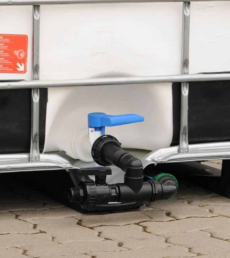 Tankverbindungs Basisset für zwei hintereinanderstehende IBC- Regenwassertanks, dass aus einem verschraubten, hochwertigen PVC-Winkel und T-Stück besteht.