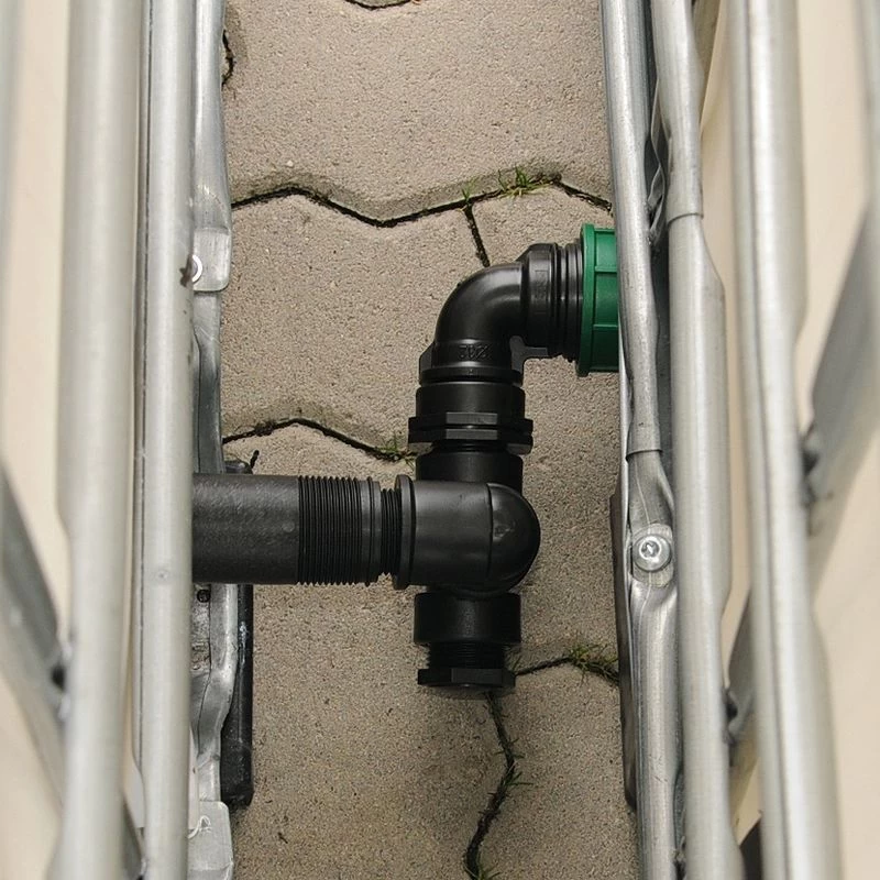 Tankverbindungs Basisset für zwei hintereinanderstehende IBC- Regenwassertanks, dass aus einem verschraubten, hochwertigen PVC-Winkel und T-Stück besteht.
