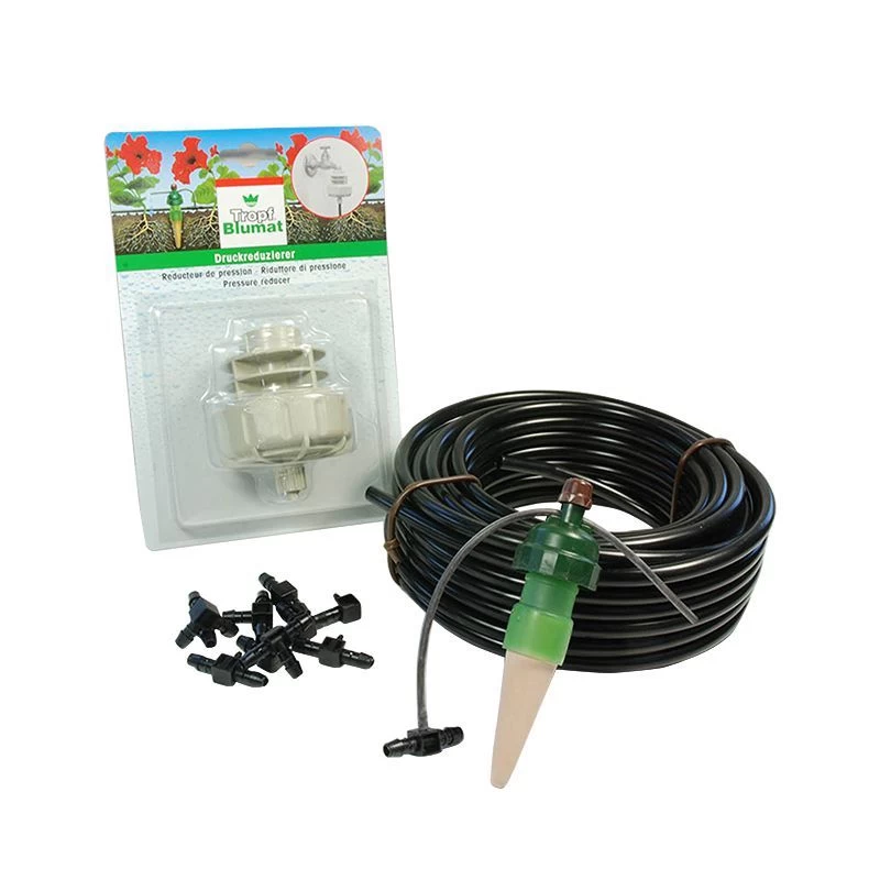 BLUMAT Tonkegelbewässerungsset für 10 m einsetzbar auf Balkonen, Terrassen, für Kübelpflanzen und im Gewächshaus, bestehend aus: , 40 Tropfern, 15 m Zufuhrschlauch, 1 Druckreduzierer und Schlauchverbindern (je 2 Winkel, Verbinder, Endstück, T-Stück, Schlauchabzweige) , Wasserausbringung über fe