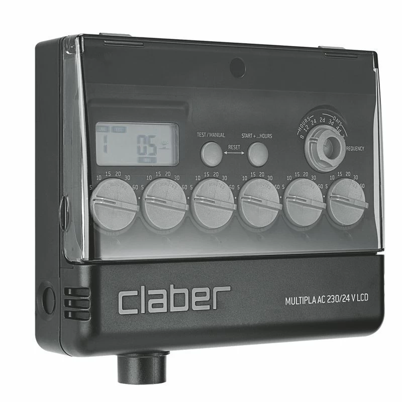 Elektronischer Bewässerungscomputer mit 6 Leitungen und einfacher Programmierung: einfach die gewünschte Bewässerungsdauer mithilfe der 6 Drehgriffe einstellen: 5 – 10 – 15 – 20 – 30 – 60 Minuten. Befehl „Frequency“ für die Auswahl der Wiederholung des Bewässerungsprogramms in festgelegten Zeitintervallen: 8 Stunden – 12 Stunden – 24 Stunden – 2 Tage – 3 Tage – 4 Tage – 7 Tage. „Start“-Taste für den sofortigen Start des Programms oder Funktion „Manual“ in der Testphase der Anlage. „Start + … Hours“-Taste für eine Verzögerung des Programmstarts um bis zu 23 Stunden. Ein System blinkender LED-Leuchten zeigt die Öffnung der Ventile, die Wahl der Option „verzögerter Start“ und die korrekte Stromversorgung an. Sicherheitsvoreinrichtung zur Ventilöffnung mit einer Verzögerung um 5 Sekunden. Pumpensteuerung. 9V Alkaline-Pufferbatterie. Externer Transformator 230-24 V im Lieferumfang enthalten. Erfüllt die EG-Richtlinien.